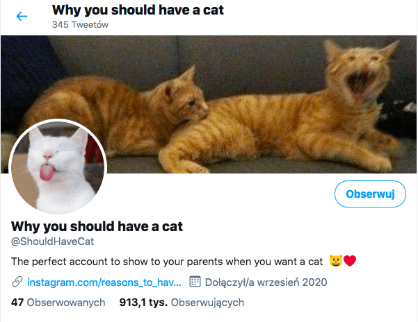 Na Twitterze utworzono konto „Dlaczego powinieneś mieć kota”, które zostało opisane jako „idealne konto do pokazania rodzicom, gdy chcesz mieć kota”. Ten profil to skarbnica zarówno uroczych, jak i zabawnych kocich zdjęć. Istnieje spore prawdopodobieństwo, że pokazując je osobie, którą chcesz przekonać do kota, osiągniesz zamierzony cel. To konto sprawi, że każdy się uśmiechnie, nawet zagorzały przeciwnik domowych tygrysków. Obecnie profil obserwuje ponad 900 tysięcy osób, a liczba ta z dnia na dzień tylko wzrasta.