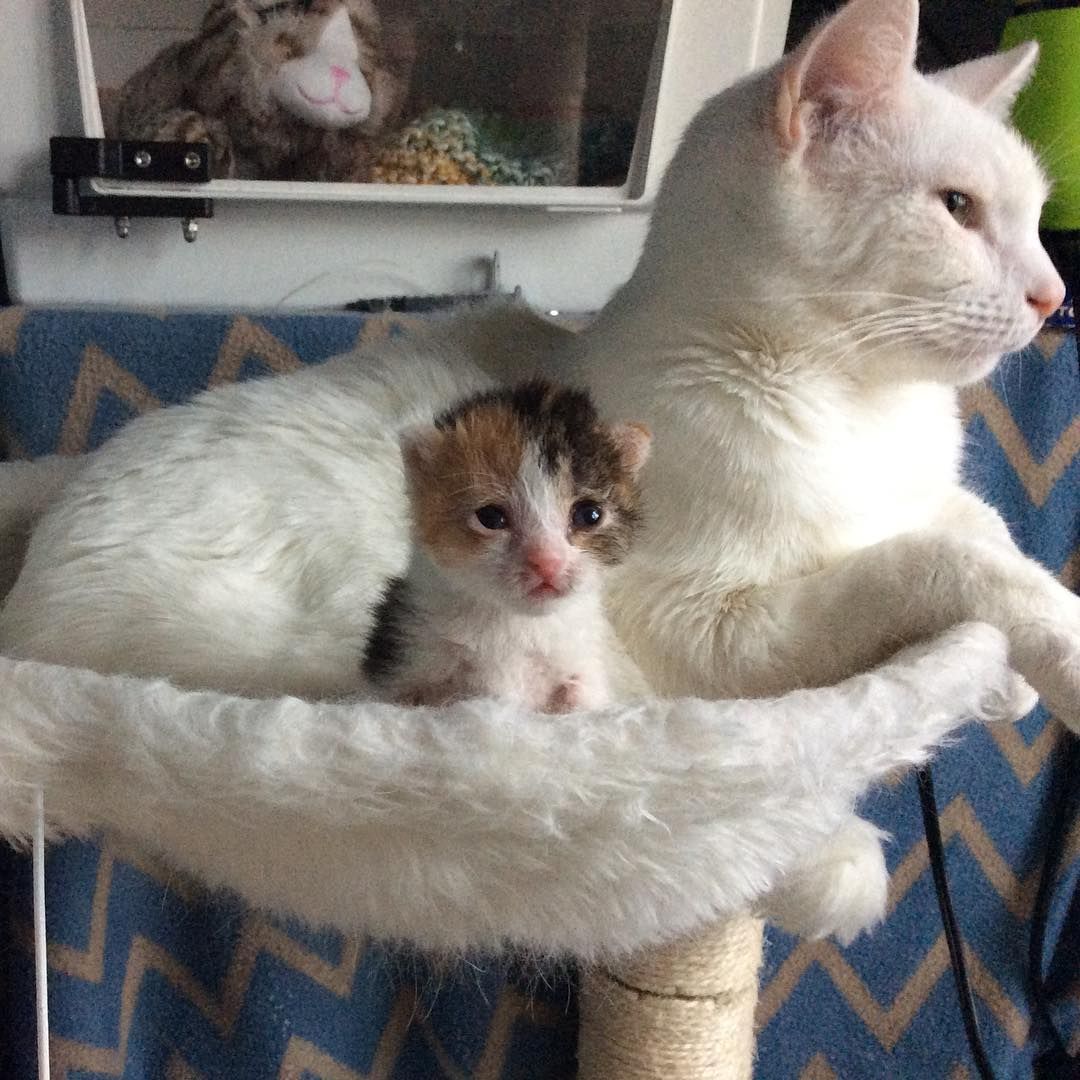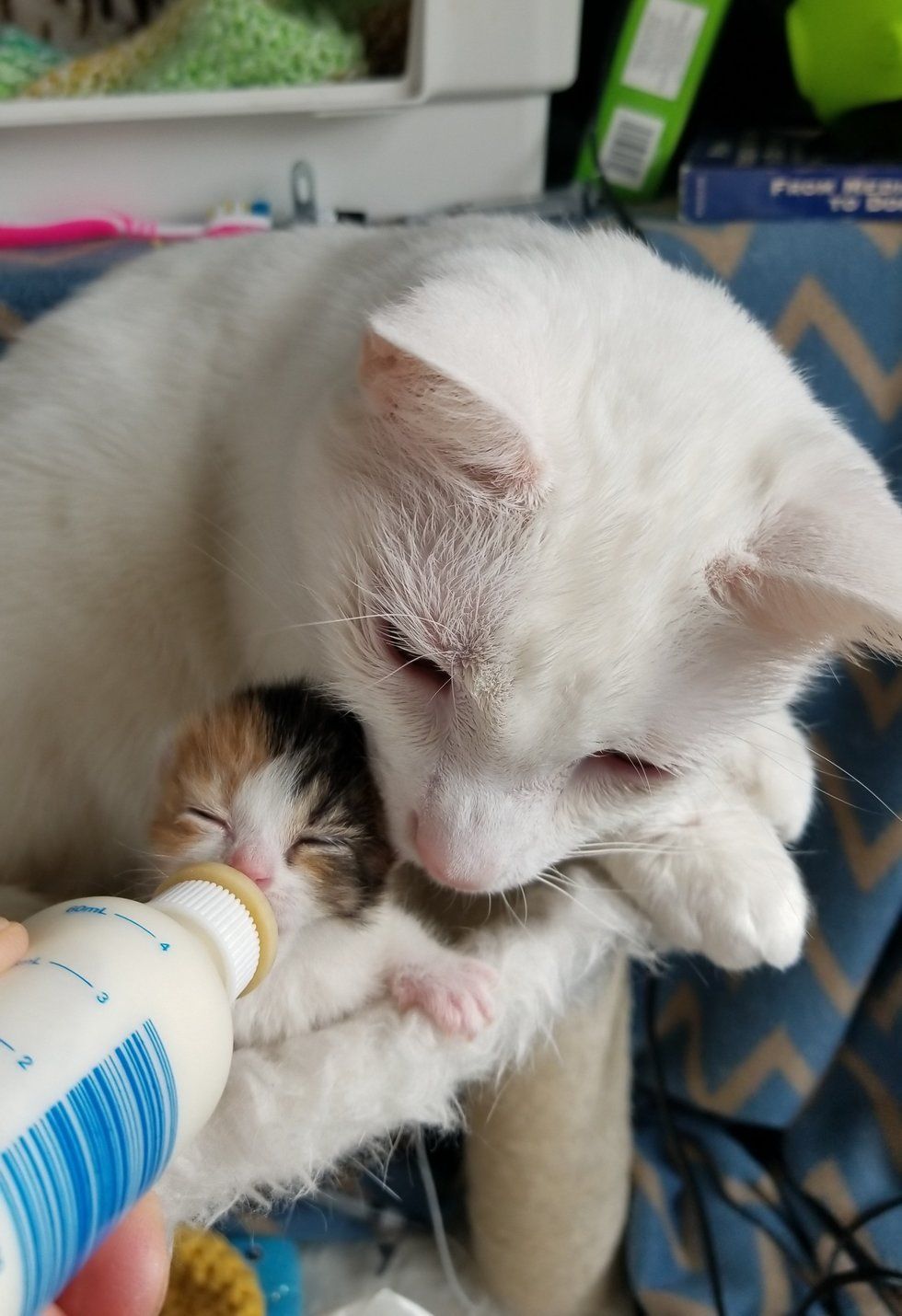 Koci tata umył maleństwo, które otrzymało imię Adora. Następnie pomógł w karmieniu. Ponadto obdarzył malucha tym, czego potrzebował najbardziej – ciepłem i solidną dawką bliskości oraz pieszczot.