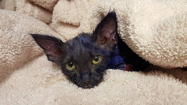 Nie, nie urodził się taki. To człowiek świadomie przefarbował czarnego zwierzaka. W lecznicy wykąpano malca, a następnie ogolono.