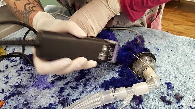 Fioletowy barwnik wniknął głęboko, nadal pozostał widoczny mimo zabiegów. Pod sierścią ukazały się liczne kłute rany, pochodzące od zębów psa.