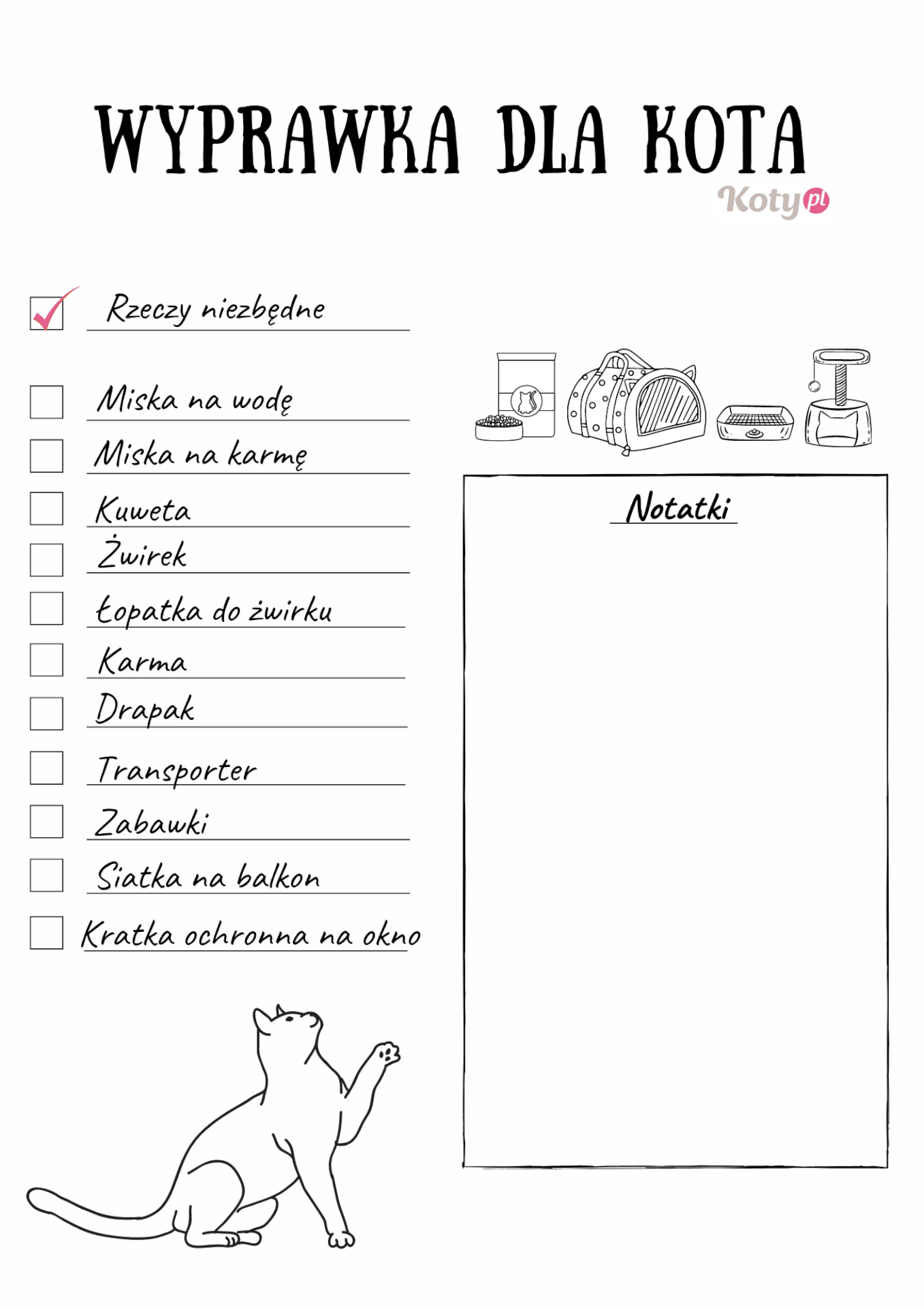Aby w ferworze radości o niczym nie zapomnieć, przygotowaliśmy infografikę z listą rzeczy, które – naszym zdaniem – są niezbędne zarówno dla młodego, jak i starszego kota. Kompletując pierwszą wyprawkę, skup się jedynie na najpotrzebniejszych akcesoriach. Zachęcamy do skorzystania z naszej listy i wydrukowania jej, by na bieżąco odhaczać punkty, które już zostały zrealizowane. Jest też możliwość dodania własnych.