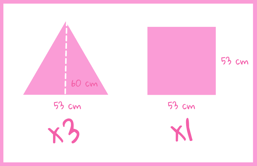 - 3 trójkąty materiału o podstawie 53 cm i wysokości 60 cm,